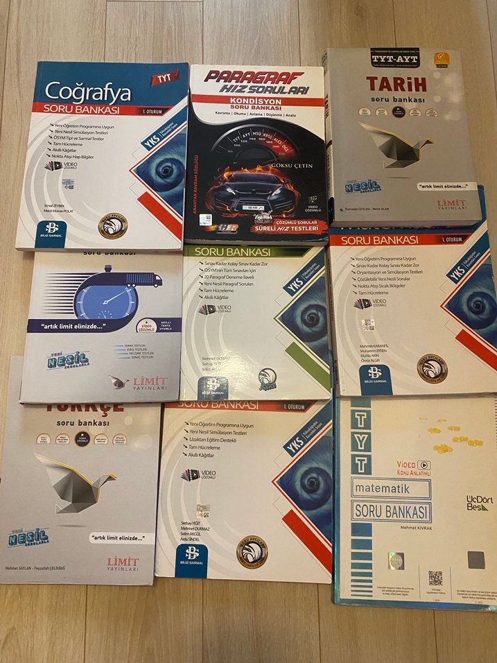 Bilgi sarmal , 345 yayınları , Limit yayınları , Hız yayınları gibi güzel yayınlar mevcut ortalama 90-100 kitap var 15 tane de deneme var alan arkadaşlara onları da hediye göndericem uygun fiyattan veriyorum öğrenci arkadaşlarım yararlansın diye toplu alımda fiyatta yardımcı olurum zaten hespsini ortalama 10 kitap parasına satıyorum