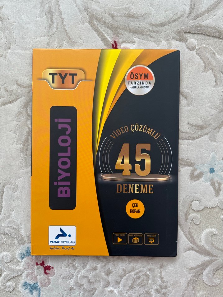 ÖSYM tarzında hazırlanmış TYT biyoloji 45 deneme sınavı, video çözümleri ve çek kopar sayfaları içerir. İlk 5 test çözülmüştür geri kalanı boştur.