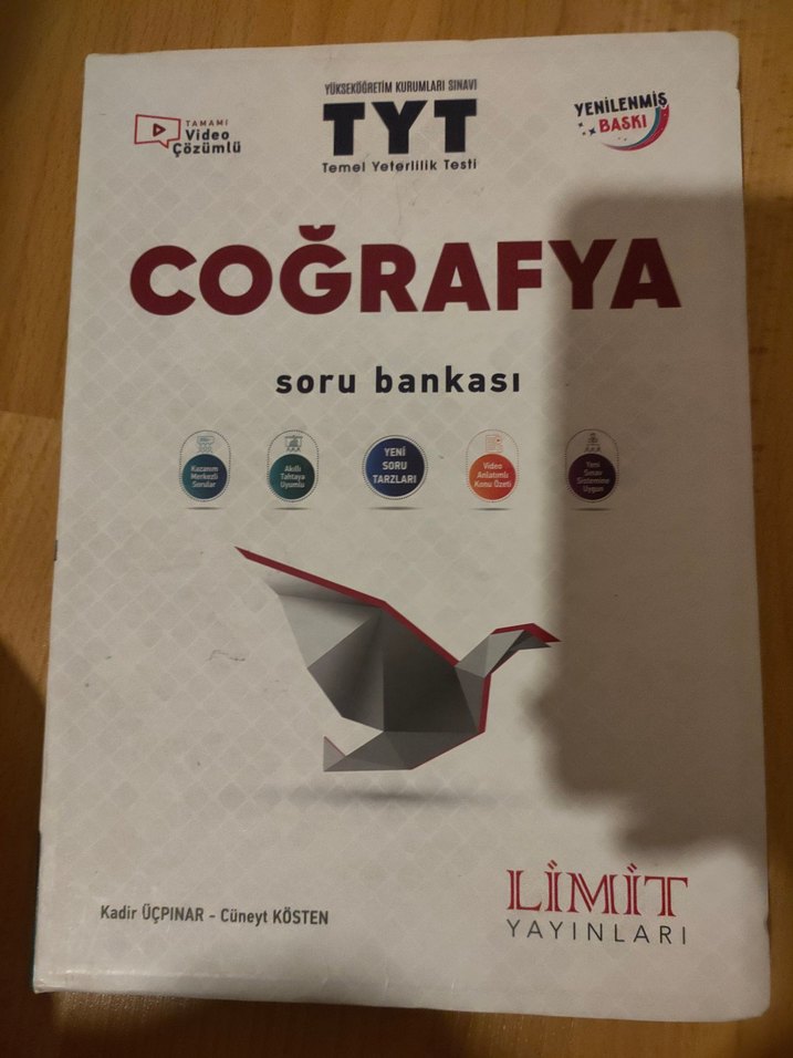 Limit Yayınları'ndan TYT Coğrafya soru bankası, yenilenmiş baskı ve video çözümleri ile sınav hazırlığı için. Sıfır gibi nerdeyse hiç kullanılmadı fotoğrafta ki işaretli yerler dışında. Tekliflere açığım.