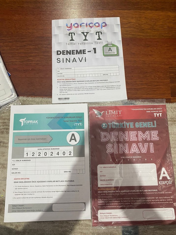 Yaricap, Toprak ve Limit yayınlarından oluşan 3 adet TYT deneme sınav kitabı, cevap kağıtları ile birlikte.