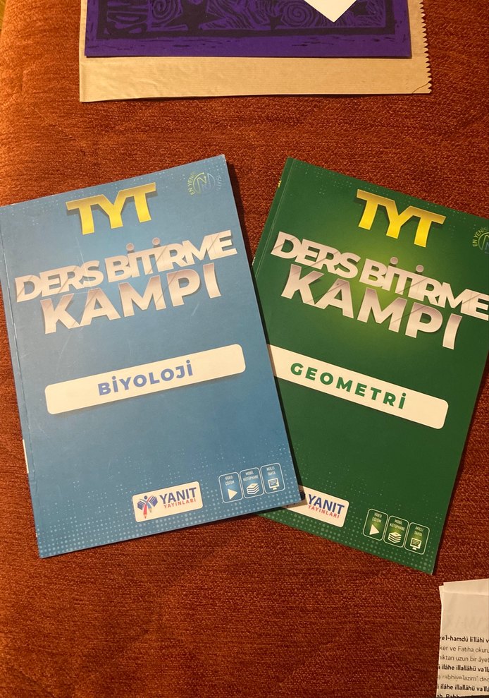TYT sınavına yönelik biyoloji ve geometri ders bitirme kampı kitapları, konuları tekrar etme amaçlı ince kitaplar. Biyolojiden sadece 1 sayfa çözülmüş kalanı tertemiz. Geometri hiç çözülmemiş. İkili fiyatı