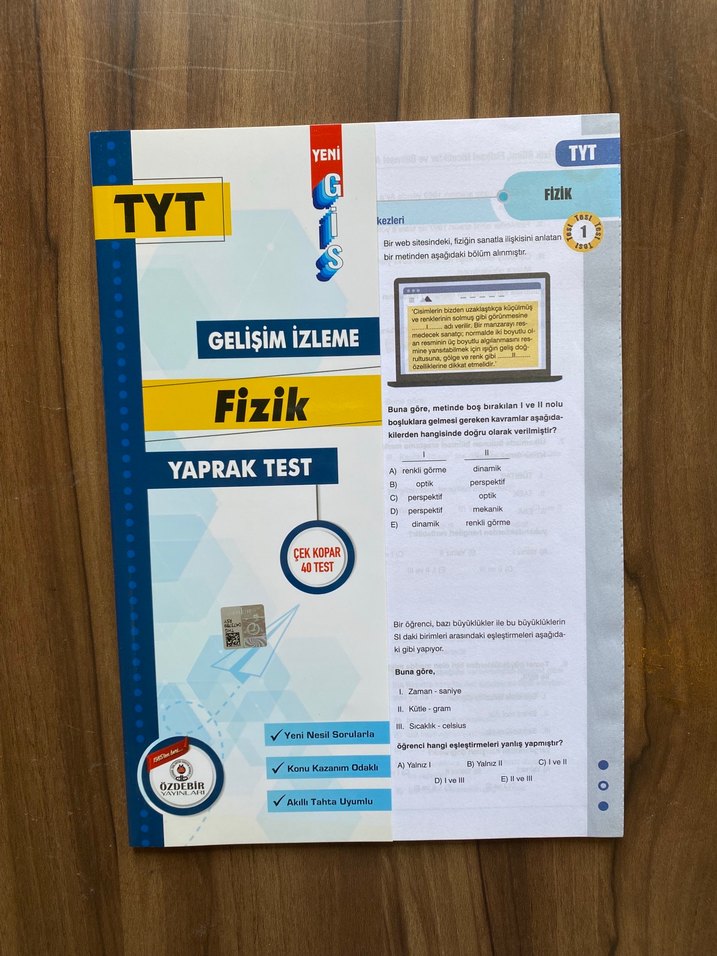 TYT Fizik Gelişim İzleme yaprak test kitabı, yeni nesil sorularla 40 yaprak test içerir, konu kavramına odaklı ve müfredata uygundur.