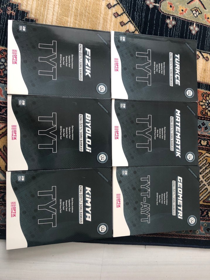Fizik, biyoloji, kimya, matematik, geometri ve Türkçe derslerini içeren TYT-AYT sınav hazırlık kitapları seti.