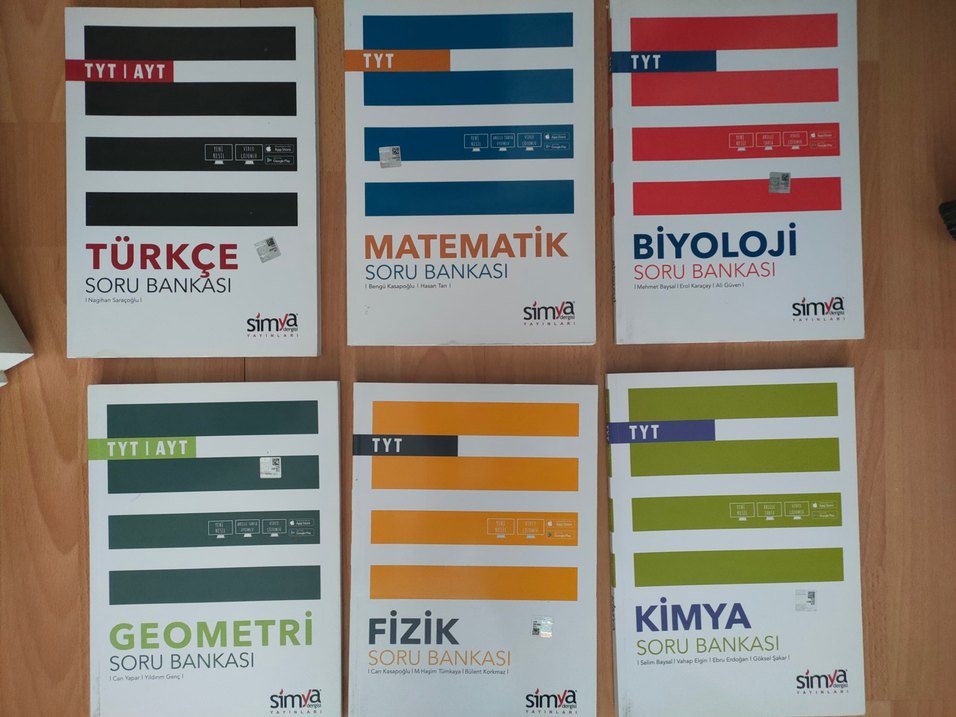 Simya yayınları TYT Matematik, Biyoloji, Geometri, Fizik ve Kimya Türkçe soru bankaları TANE FİYATI 80TL DİR HANGİLERİNİ ALMAK İSTİYORSANIZ mesaj / teklif kısmından ulaşabilirsiniz ayrı da satılır. bir kaç tanesinde 4,5 test çözülü diğerler sıfır