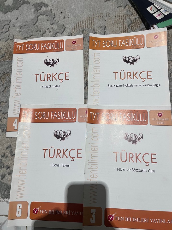 TYT sınavı için sözcük türleri, ses-yazım-noktalama ve anlam bilgisi, genel tekrar ve sözcükte yapı konularını içeren Türkçe soru fasikülleri seti.