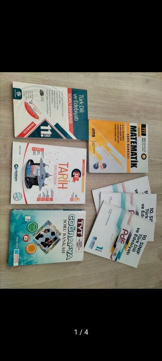 Evrensel iletişim yayınları tyt coğrafya soru bankası toplam 336 sayfadır sayfa 43'e kadar çözülmüştür ve arada sayfa 50'den 67'ye kadar çözülmüştür Ens yayınları tyt matematik soru bankası toplam 304 sayfadır 70'e yakın da (emin değilim) sayfa çözülmüştür (aralardan soru çözülmüştür) Eğitim vadisi Türk Dili ve edebiyatı dersi 1. 2. 3. modül bulunmaktadır modül bir 72 sayfadır modül 2 104 sayfadır modül 3 104 sayfadır modül 1 tamamı çözülmüştür konu anlatım kısmında fosforlu kalemle çizikler vardır modül 2 az çözülmüştür (3-5 test falan) konu anlatım kısmında fosforlu kalemle çizikler vardır modül 3 az çözülmüştür (3-5 test falan) konu anlatım kısmında fosforlu kalemle çizikler vardır (modüller genel olarak konu anlatımıdır içinde çok fazla test bulunmamaktadır) Bilgi sarmal 11. sınıf Türk edebiyatı soru bankası ve Gezegen yayınları 11.sınıf tarih soru bankası hediye olarak gönderilecektir