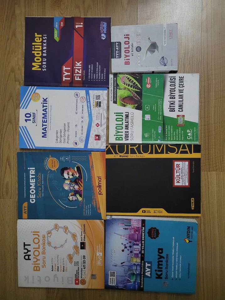 TYT ve AYT fizik, biyoloji, matematik, geometri, kimya ve diğer dersleri içeren soru bankası seti.