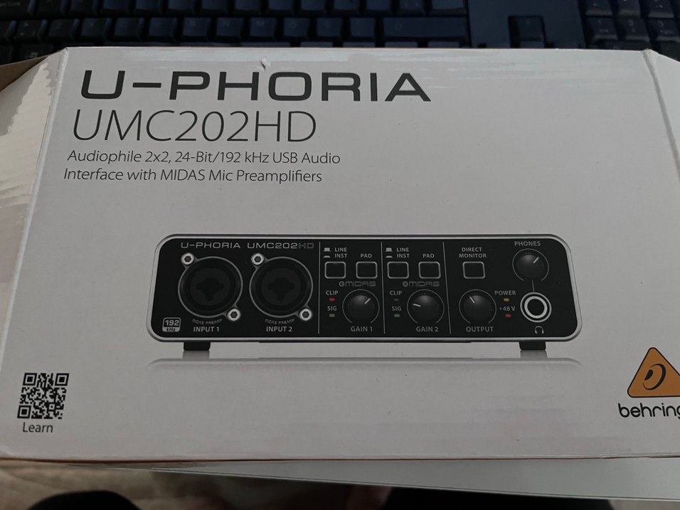 U-PHORIA UMC202HD, 24-Bit/192kHz USB ses kalitesi ve MIDAS mikrofon ön amplifikatörlerine sahip koyu siyah renkli müzik sistemi. Giriş ve çıkış bağlantıları bulunur. Hiçbir sorunu yok tertemiz