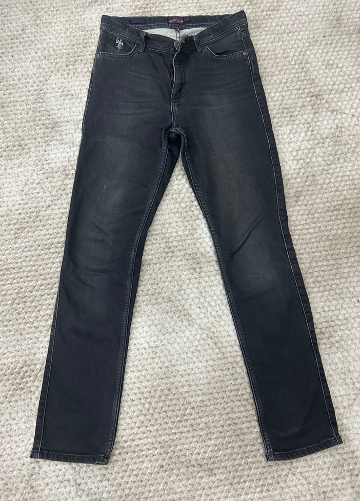 Ürün az kullanılmıştır. 13-14 yaş U.S. Polo marka koyu gri jean pantolon. İç kısmında beli için ayarlanabilir lastikleri vardır.