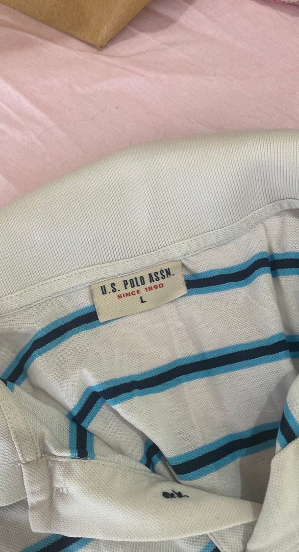 U.S. Polo Assn. marka, düğmeli, kısa kollu, beyaz zemin üzerine mavi çizgili, sentetik kumaştan yapılmış, rahat kesim ve midi boy erkek polo tişörtü.