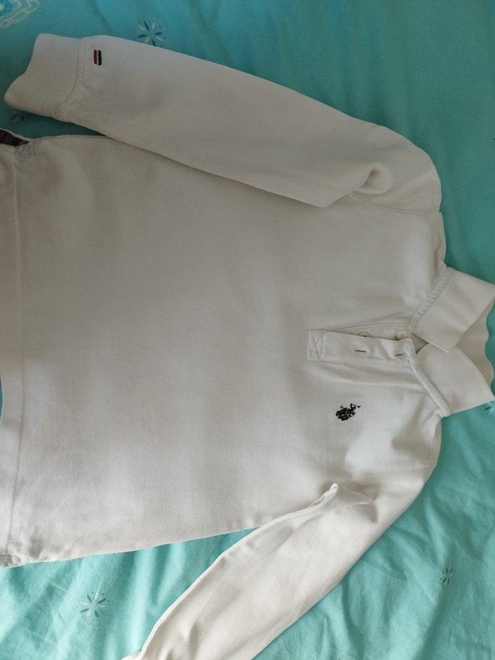 U.S. Polo Assn. markalı, uzun kollu, yakalı ve düğmeli beyaz erkek çocuk polo tişört. Düz desensiz ve hafif dokulu sentetik kumaştan üretilmiştir. Sorunu yoktur