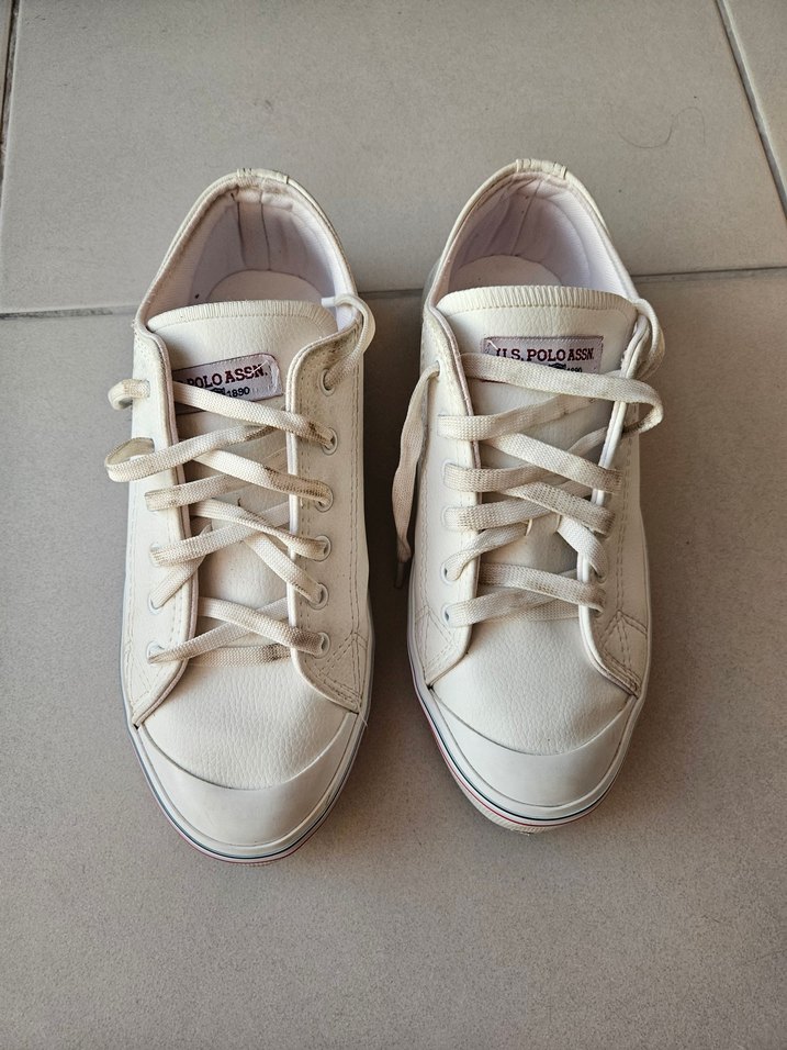 U.S. Polo Assn. beyaz erkek sneakers, düz tabanlı kauçuk taban, minimalist tasarım ve günlük rahat kullanım için zahmetsiz şıklık sunar.