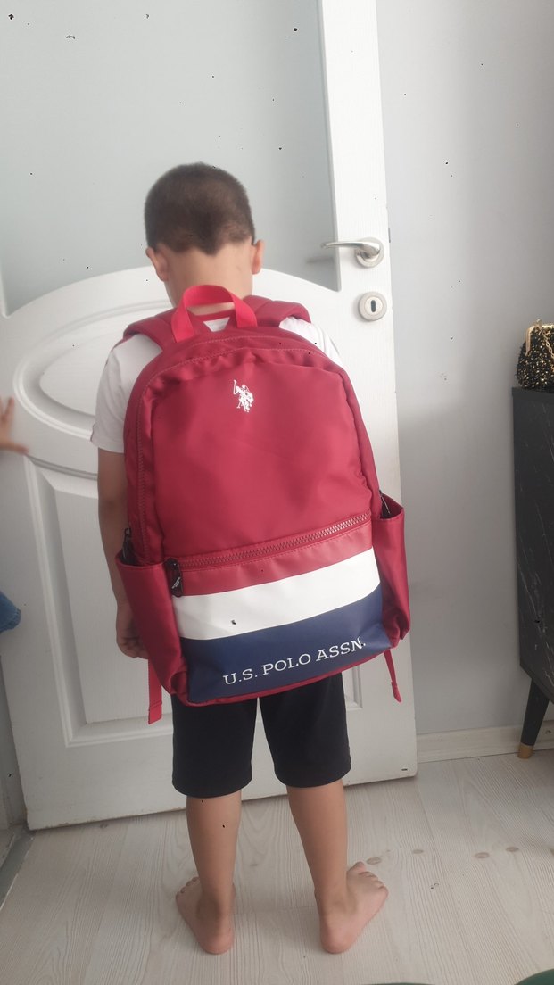 U.S. Polo Assn. kırmızı çocuk okul çantası, geniş ana bölme, yan cepler ve marka logolu ön panel içerir. Ayarlanabilir askıları vardır.