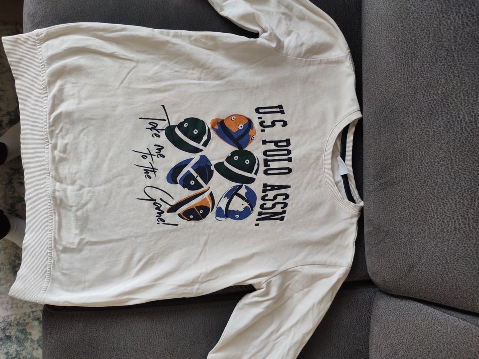 Beyaz pamuklu, uzun kollu, yuvarlak yaka erkek çocuk sweatshirtü. Rahat kesim ve renkli baskılı tasarım, "U.S. POLO ASSN." yazılı.