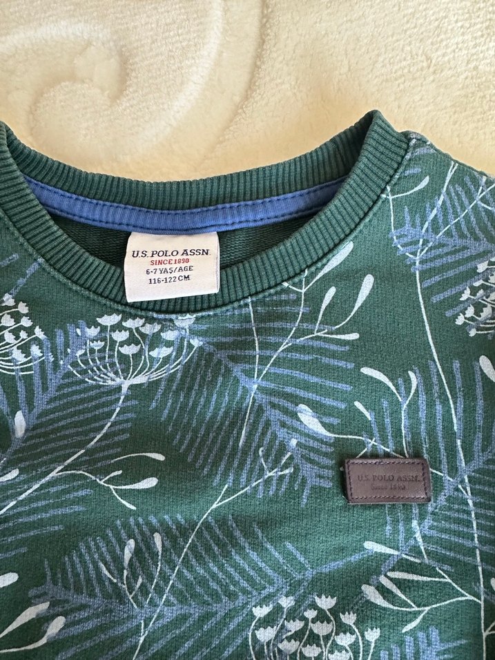 U.S. Polo Assn. erkek çocuk sweatshirt, yuvarlak yaka ve uzun kolludur. Yumuşak, örme tüylü kumaştan yapılmış, pastel yeşil renkli baskılı bitki desenlerine sahiptir.