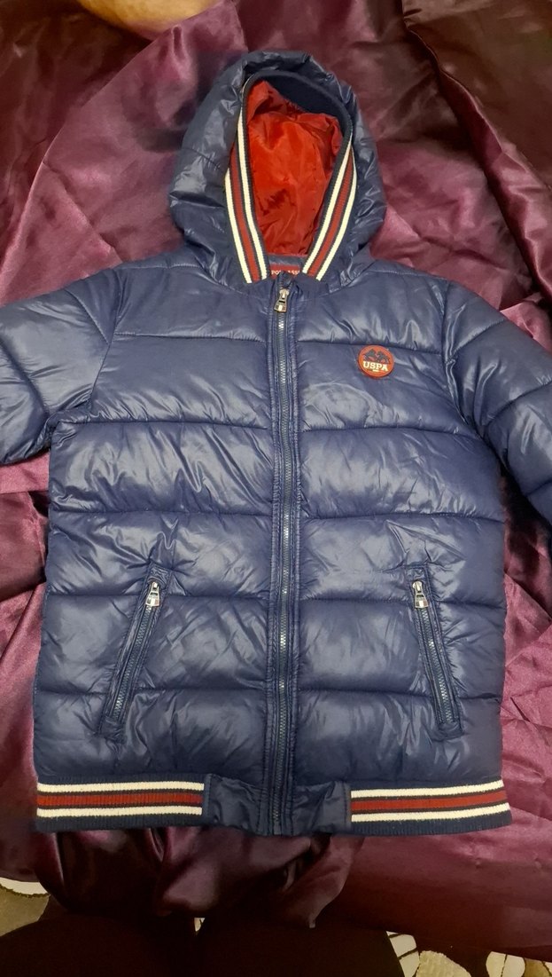 Erkek çocuklar için lacivert renkli,10-11 yaşa uygun kalın tam kışlık, fermuarlı ve kapüşonlu, dar kesim sokak stili mont. u.s polo marka kalitesi..Ufak tefek elle düzeltilecek sökük yerleri var görünmeyen yerlerde koltuk altını diktim hatta elimde görünmüyor. Kumaşı sorunsuz fermuarları sağlam kışın sıcacık tutan bir mont.