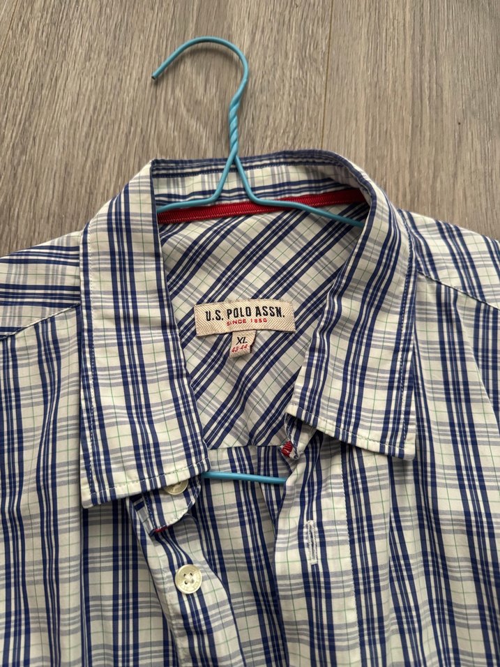 U.S. Polo Assn. Erkek gömlek, yakalı ve düğmeli, kısa kollu. Pamuklu kumaş, bol kesim ve mavi kareli desenle günlük rahatlık sunar.
