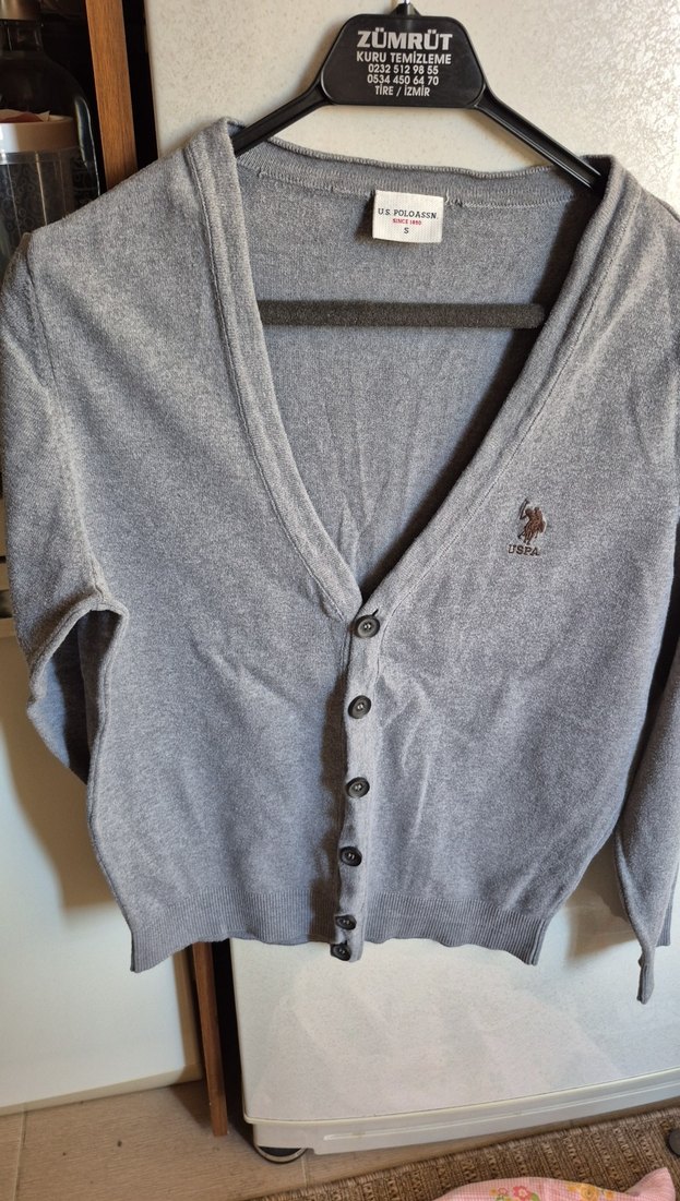 U.S. Polo Assn. gri renkte, düğmeli ve V yakalı erkek hırka. Uzun kollu, rahat kesim ve günlük sokak stili için uygundur.