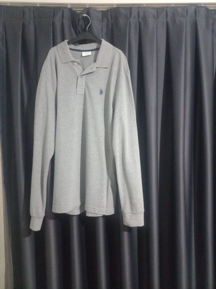 Gri renk, uzun kollu, düğmeli yakalı polo tişört. Yumuşak ve sıcak kumaştan, bol kesim, gündelik sokak stili için uygun. ️M beden