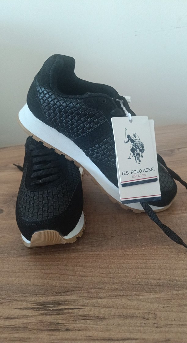 U.S. Polo Assn. kadın spor ayakkabısı, baskılı siyah üst yüzey, cırt cırtlı kapanış ve kauçuk tabanlıdır, sportif sokak stiline uygundur.