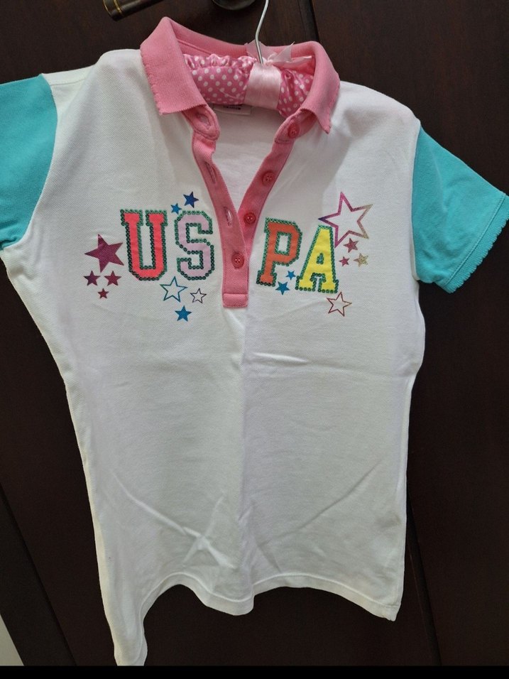 U.S. Polo Assn. kız çocuk tişörtü, kısa kollu, düğmeli yakalı ve renkli baskılı detaylara sahip, hiçbir yerinde yırtık sökük lekesi kesinlikle yoktur. ilk alındığı gibidir. sadece çok fazla katlı durduğu için ütüsüzdür.