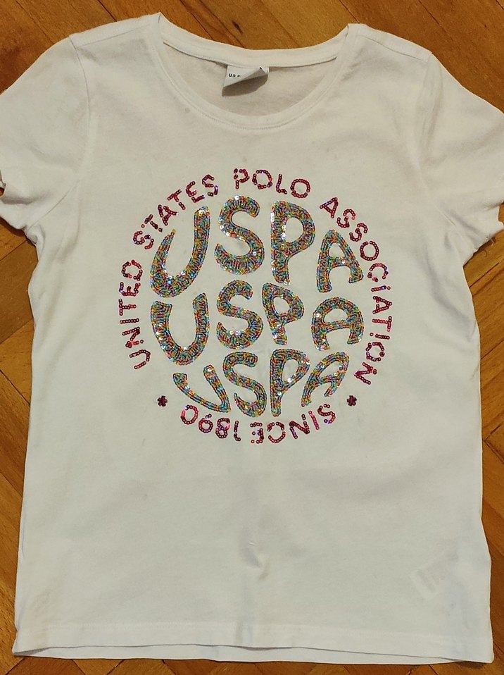 8-9 yaş kız çocukları için beyaz, pamuklu, bol kesim kısa kollu tişört. Yuvarlak yaka ve payetli, çok az giyildi. Temizdir. Orjinal üründür.