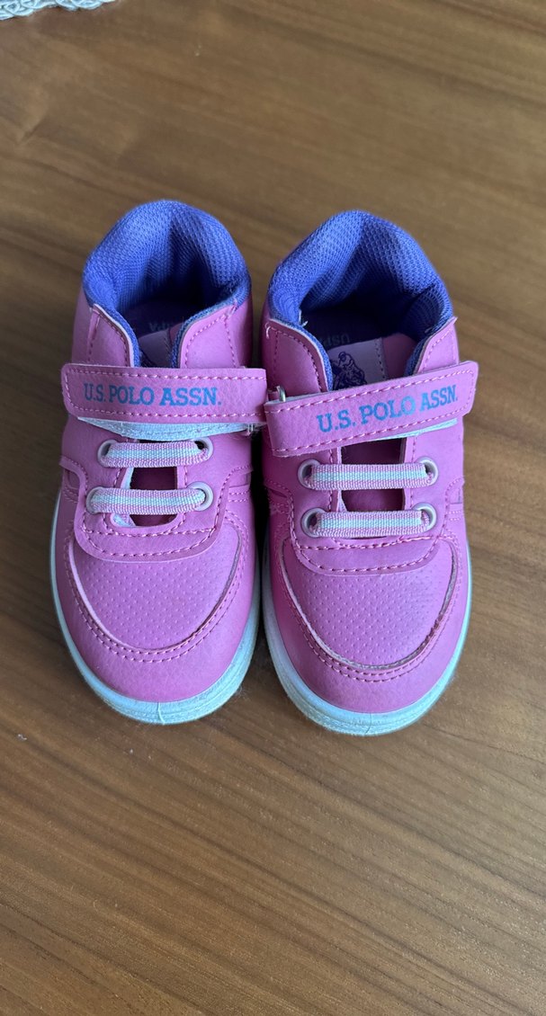 U.S. Polo Assn. marka, baskılı desenli, cırt cırtlı pembe kız çocuk spor ayakkabısı. Kauçuk tabanlı, pastel renklerle sokak stiline uygun.