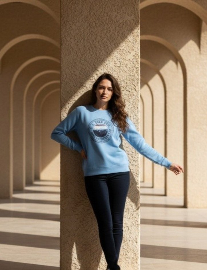 Mavi renkli, yuvarlak yakalı ve baskılı kadın sweatshirtü. Yumuşak kumaştan, bol kesim ve uzun kolludur. Günlük kullanım için rahat ve şık bir tercih.