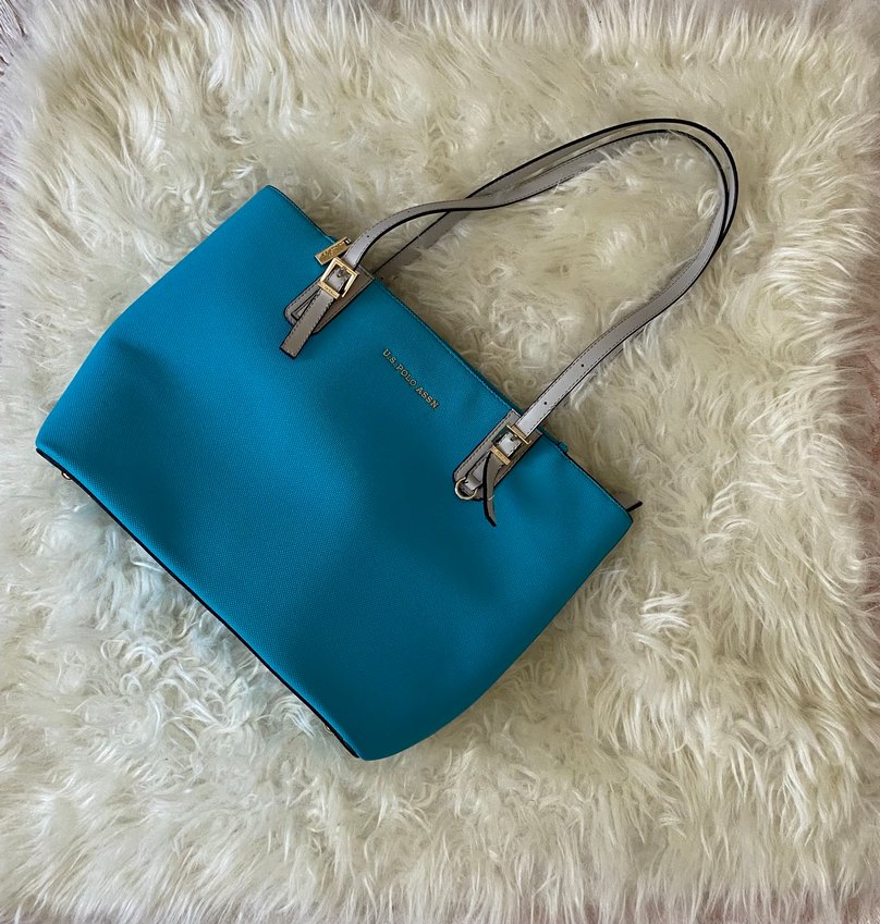 U.S. Polo Assn. markalı, mavi deri çanta, gri tokalı saplara ve baskılı desene sahip, günlük kullanım için uygun orjinaldir hediyeydi