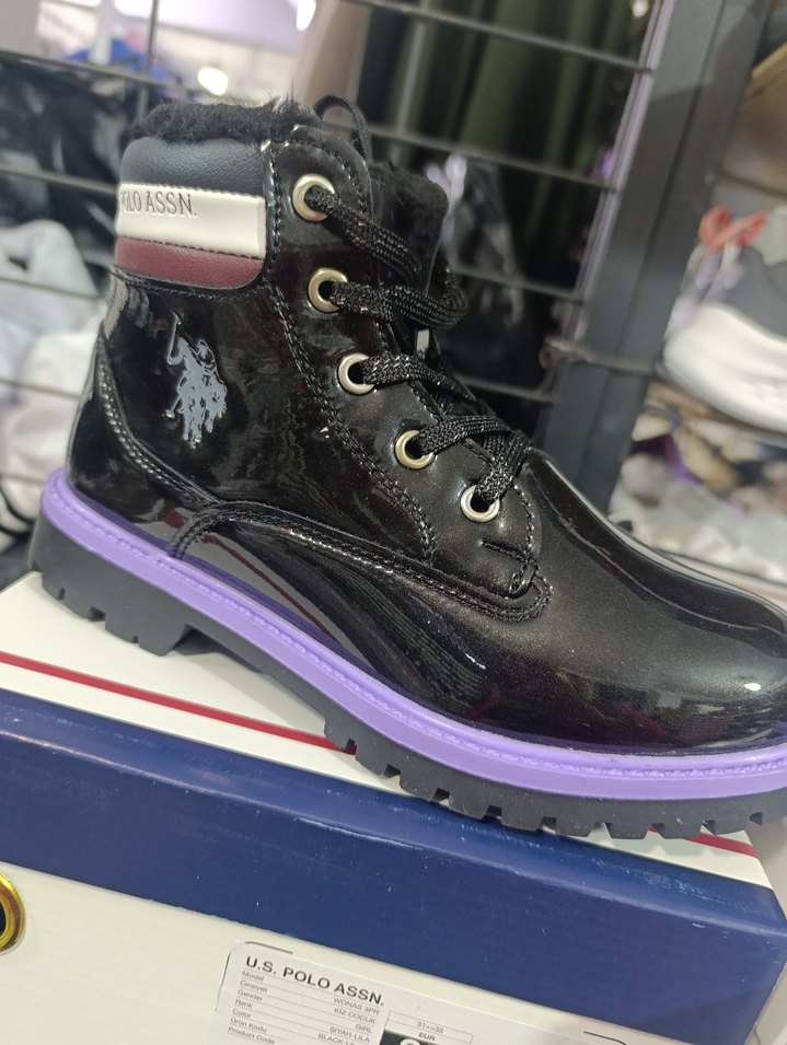 numara bilgisi alınız U.S. Polo Assn.bağcıklı bot, koyu mor kauçuk taban ve baskılı siyah üst yüzeyle sokak stiline uygun.