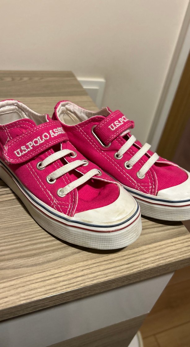 Pembe renkli, baskılı kız çocuk spor ayakkabısı, kolay kullanım için cırt cırtlı bantlıdır. Kauçuk tabanlı ve street wear tarzına uygundur. U.S. Polo Assn. markası bulunur.