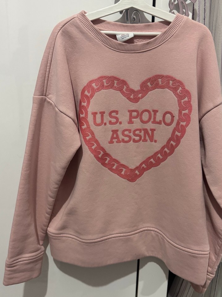 U.S. Polo Assn. pembe sweatshirt, yuvarlak yaka ve uzun kollu, gevşek kesim. Yumuşak, örme tüylü kumaştan, kalp desenli baskılı, günlük kullanıma uygun normal boyda.