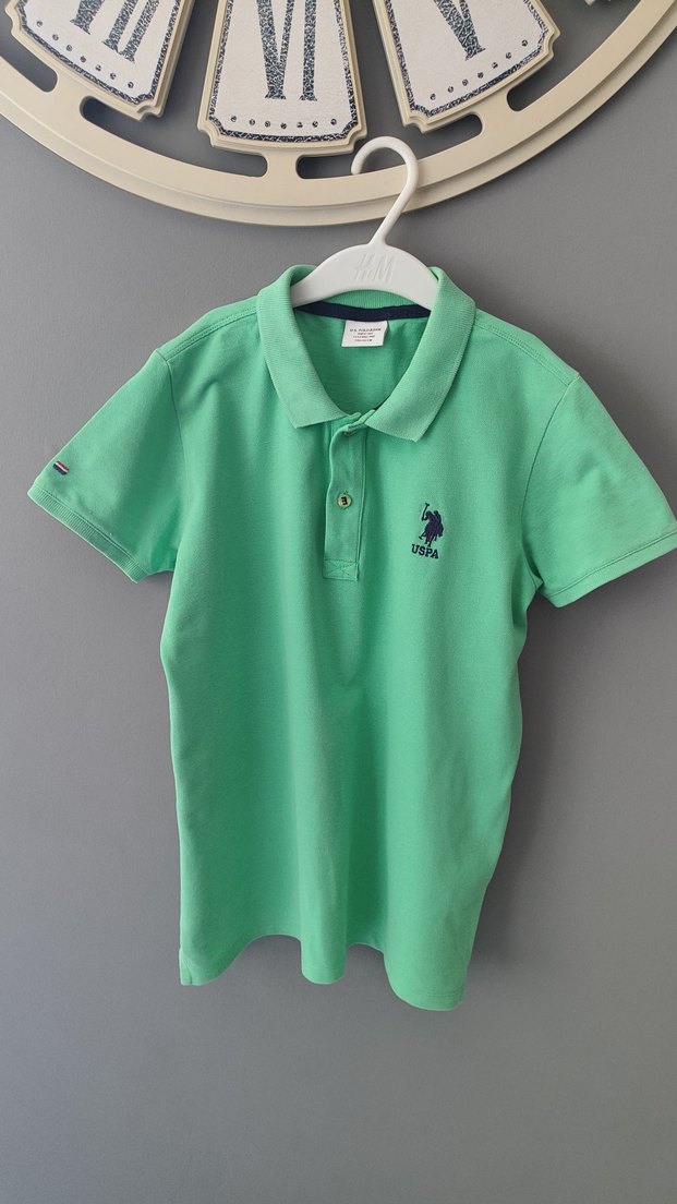 U.S. Polo Assn. erkek çocuk için pastel yeşil renkte, kısa kollu ve yakalı, düğmeli, baskılı logolu, regular kesim polo tişört. 11-12 etiketi fakat kalıp biraz dar 9-10 yaş daha uygun olur yaka kısmında resimde koydum kat yerinde hafif bir ton renk atması var kullanıma engel değil