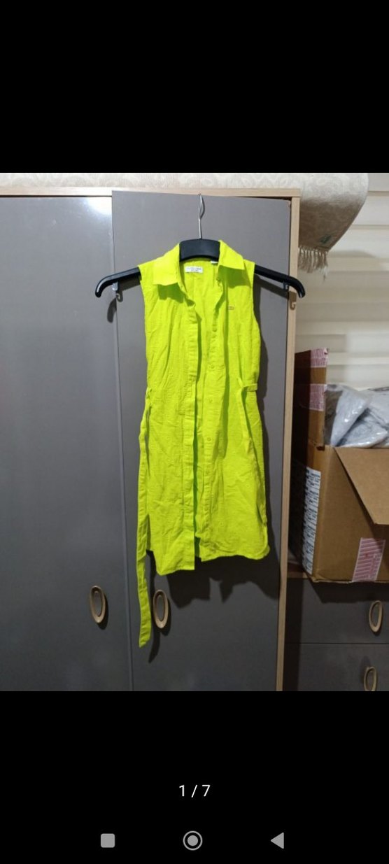 Canlı yeşil renkte, keten kumaştan yapılmış, desensiz kız çocuk gömlek belden bağlamalıdır.