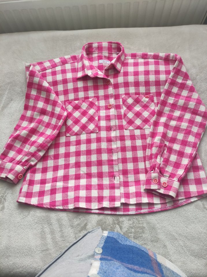 Pembe ekose desenli, düğmeli, uzun kollu kız çocuk gömleği. Pamuklu, rahat kesim ve klasik yaka detaylı, günlük kullanım için uygundur. boyu 56. genişlik 54