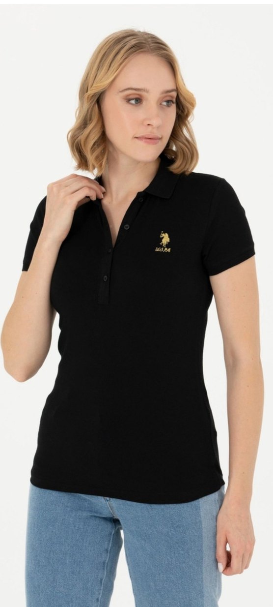 Düz siyah, polo yaka ve kısa kollu, vücuda oturan kadın tişörtü. ,küçük baskılı logo detaylı, günlük kullanım için uygun.