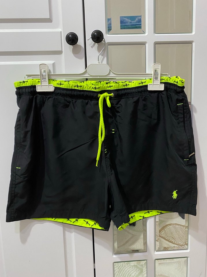 Us polo marka/ erkek lacivert deniz spor şort/ beden etiketi silinmiş/ boyutları beli lastiği genişleterek 54 cm boyu 39 cm Bel detaylı, neon sarı iç astarlı, fit kesim siyah erkek spor şortu, cesur sokak stili için uygun.