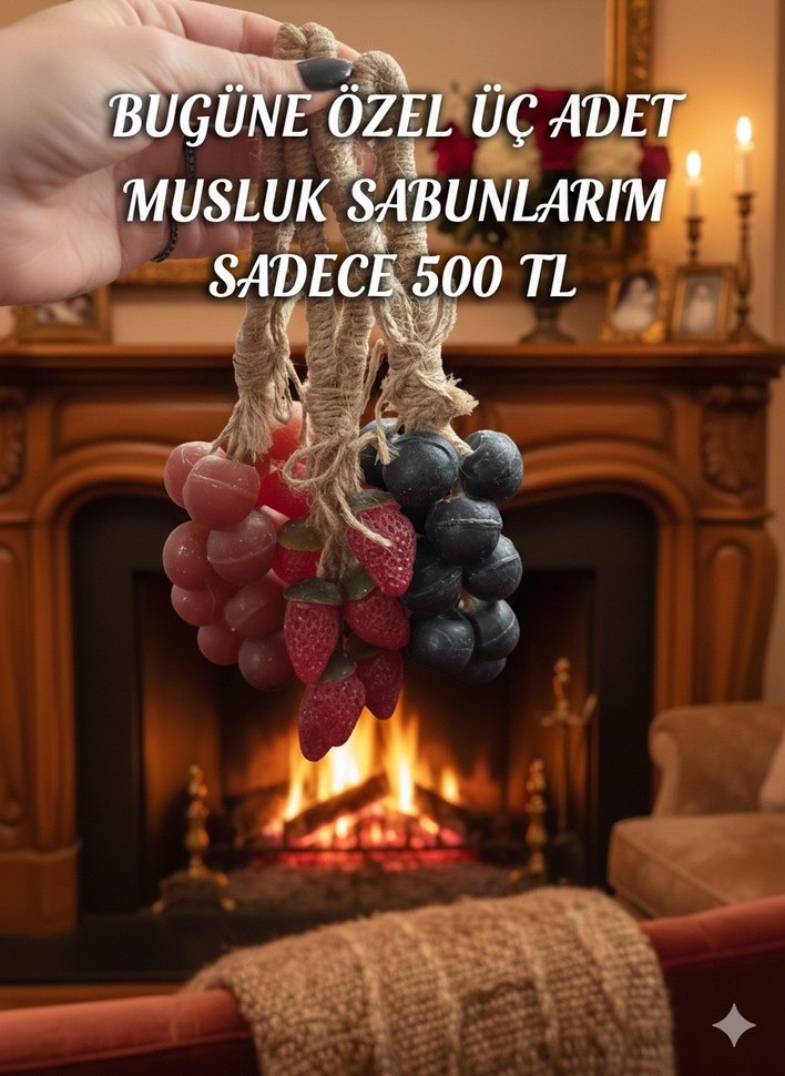 Bugüne özel 500 TL fiyatla satılan, üzüm ve çilek şeklinde üç adet musluk sabunu seti.
