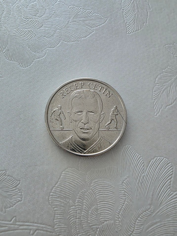 Parlak gri renkte, minimalist tasarımlı Üzerinde Recep Çetin portresi ve spor figürleri bulunur.
