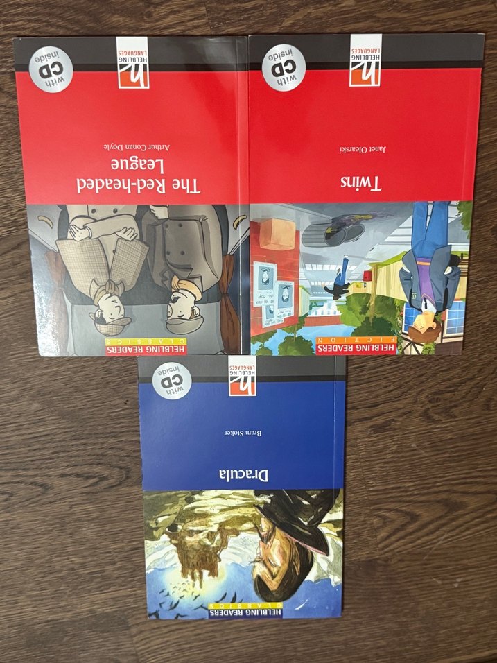 Üç çocuk kitabı seti: Twins, The Red-headed League ve Dracula. Her kitapta CD bulunur, kapaklarda hikayeye uygun renkli çizimler yer alır.