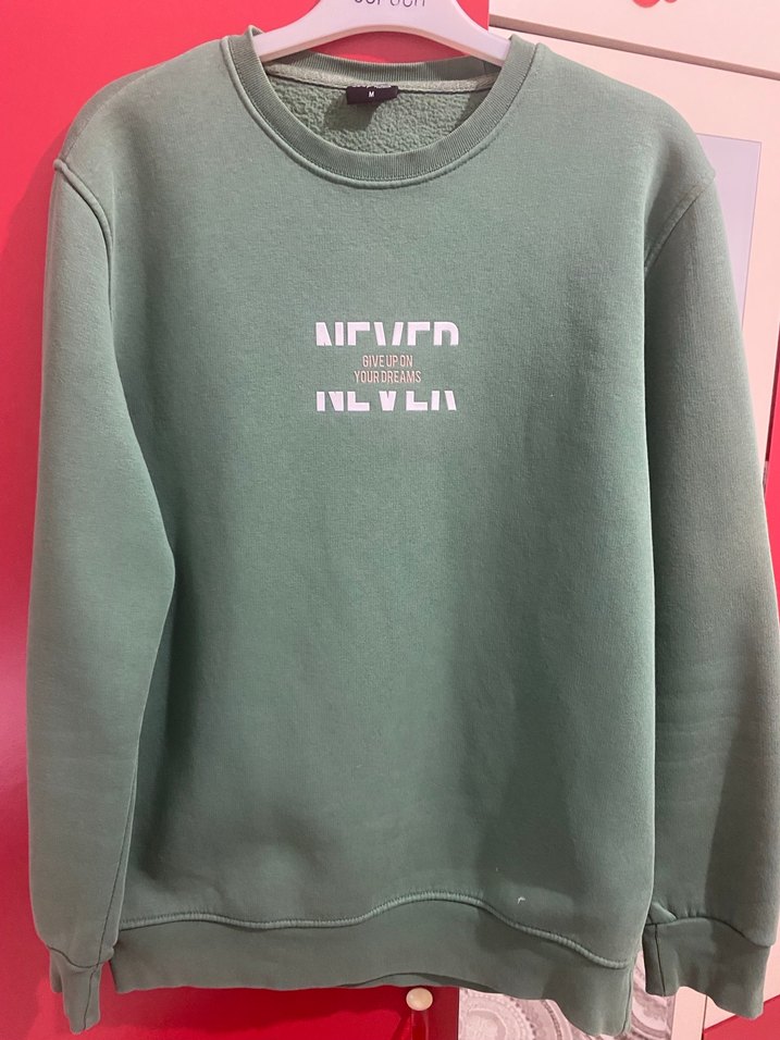 Kadınlar için bisiklet yaka, uzun kollu ve rahat kesime sahip sweatshirt. Önünde 'NEVER GIVE UP ON YOUR DREAMS' yazılı baskı bulunur. Yumuşak, sıcak kumaştan, haki tonunda günlük sokak stili için uygundur. ✨ Ürünü az kullandım fotoğrafta çektiğim yerde sadece az bir beyaz leke var. Ben 177 cm 65 kiloyum bana tam olmaktadır.