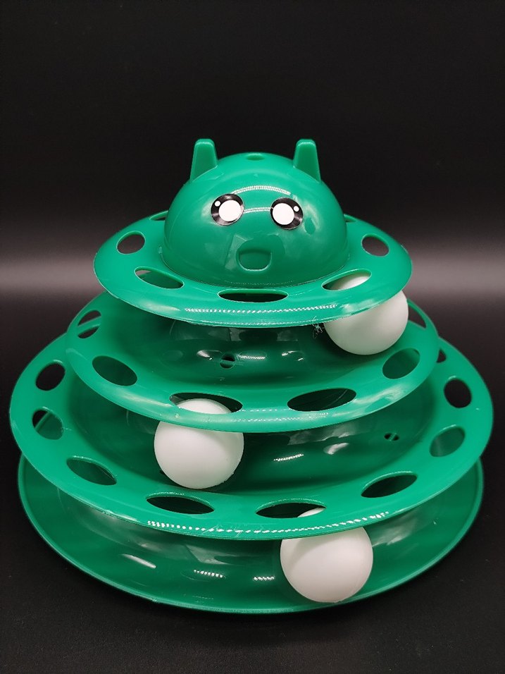 Çok katmanlı, beyaz toplu renkli yeşil kedi oyuncağı. Üst kısmında sevimli yüz tasarımı bulunur.