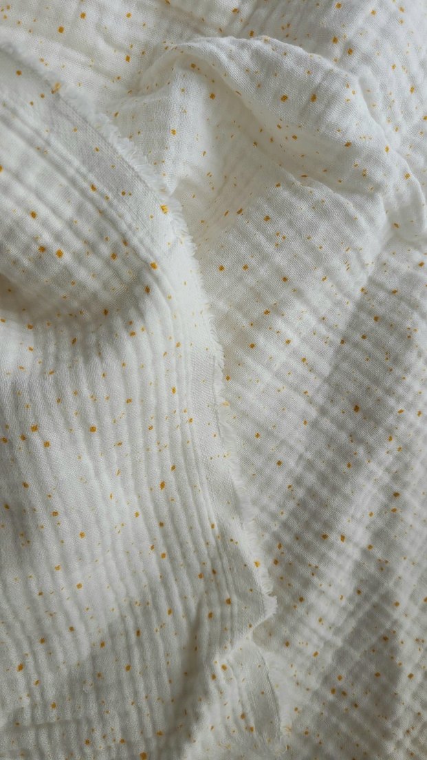 Üç katlı, saf pamuklu ,yumuşacık ,beyaz üstüne minik puanlı müslin kumaş.Eni 120 cm , boyu 180 cm.Bebek ve çocuk ürünlerine çok yakışır.Tamamının fiyatıdır.