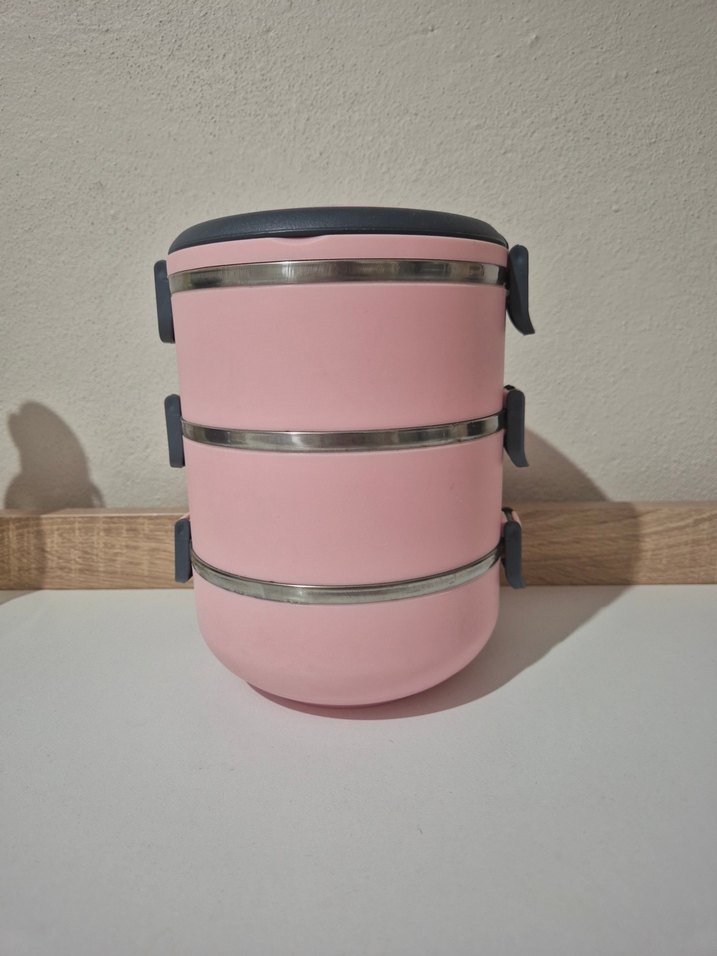 Pastel pembe renkli, üç katlı yemek kabı. Gri kilitleri ve paslanmaz çelik detaylarıyla yemekleri düzenlemeye uygundur. birkaç kere kullanıldı sadece