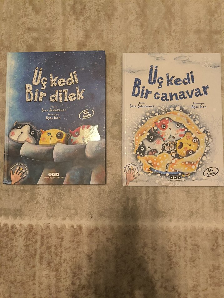 Ayşe İnan'ın çizimleriyle Sara Şahinkanat'ın yazdığı, üç kedinin hikayesini anlatan iki çocuk kitabı. Renkli ve sevimli kapaklar içerir. Üç kedi Bir canavar kitabında kuklalar var üç kedi Bir Dilek kitabında yok.