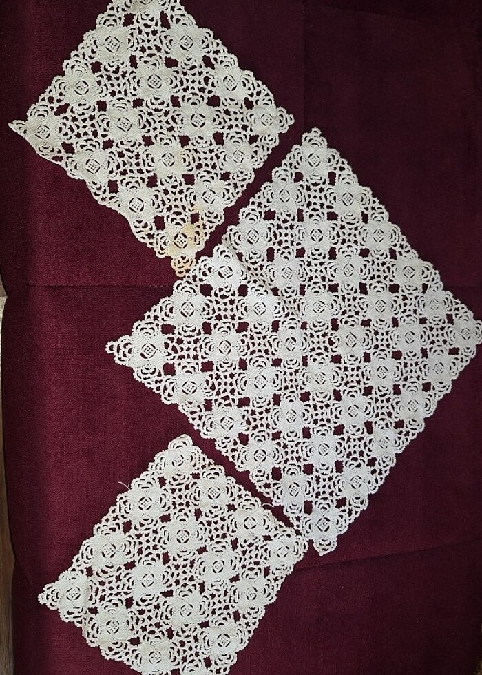 Parlak, ince dantel ipliği ile örülmüştür.Bir orta, iki yan sehpa olmak üzere 3 parçadır. Kare özellikte olup ,büyük olan 32 cm, küçük olanlar 20 cm dir.
