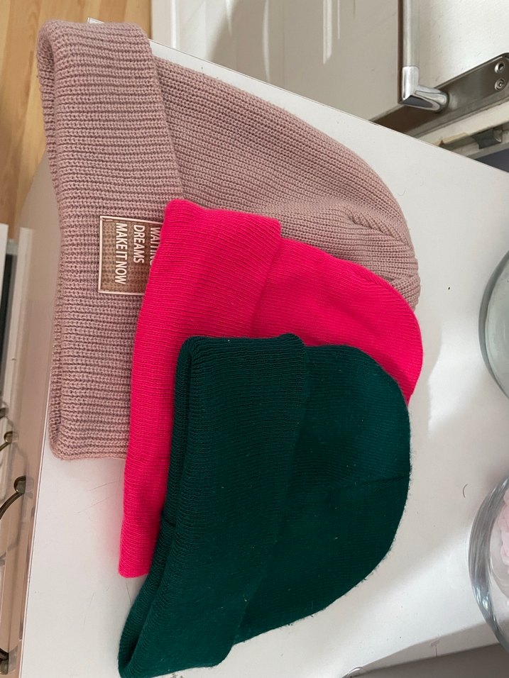 Pembe, canlı pembe ve koyu yeşil renklerde örgü kadın bereleri, rahat ve şık sokak stili için uygundur.