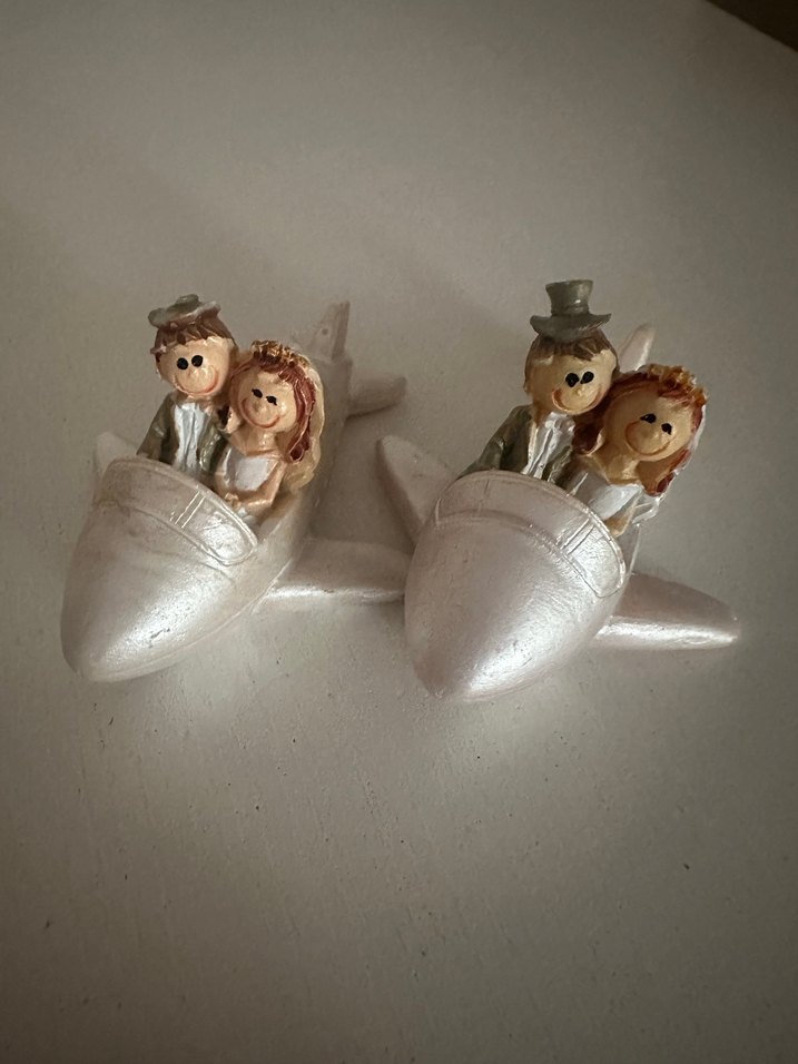 Beyaz uçak figürlü gelin ve damat biblosu. Hafif renklerde, şık detaylara sahip. Düğün dekorasyonu için uygun. ✈️ 2 Adet