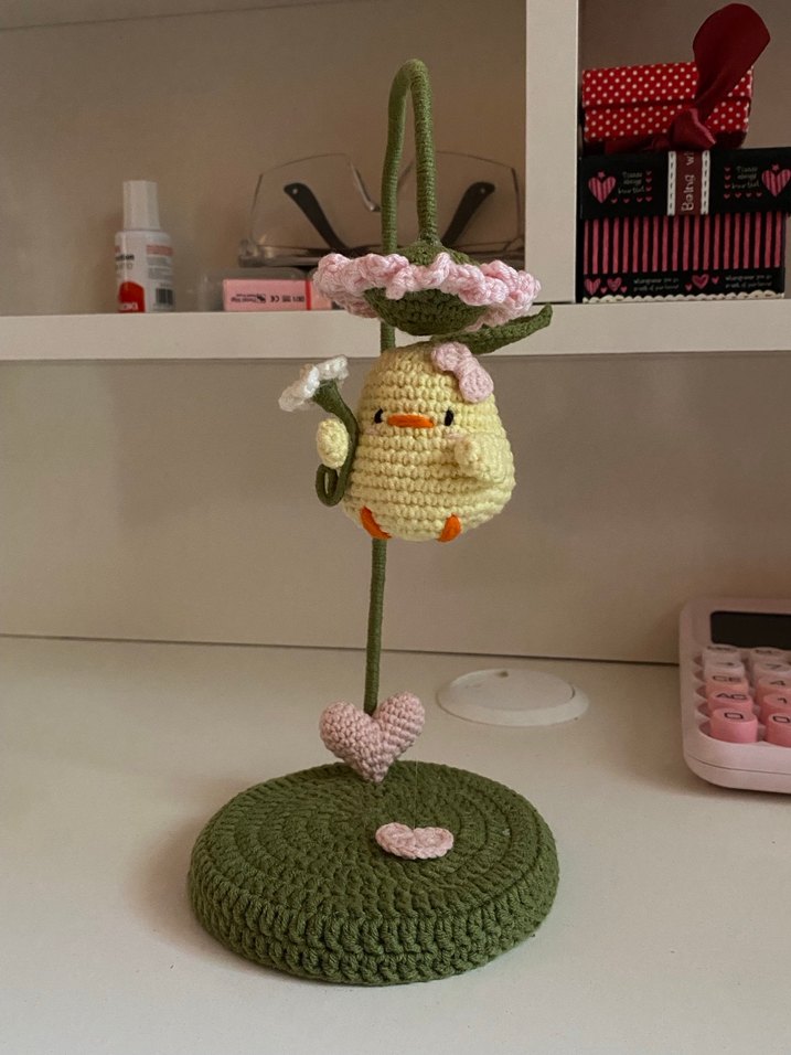 Pastel sarı renkli, pembe detaylı örgü telefon tutucu. Yeşil taban ve kalp süsü bulunur, telefon asma halkasıyla kullanılır.