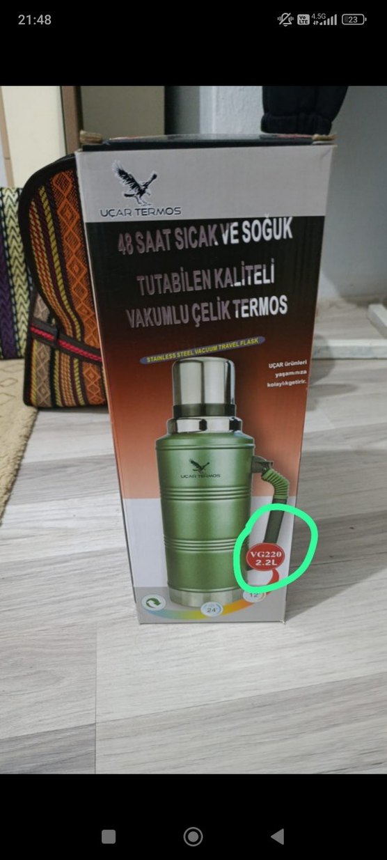 Uçar markası, 2.2 litre kapasiteli, 48 saat sıcak ve soğuk tutabilen vakumlu çelik termos. Hafif kahverengi renkte, taşıma sapı bulunur.